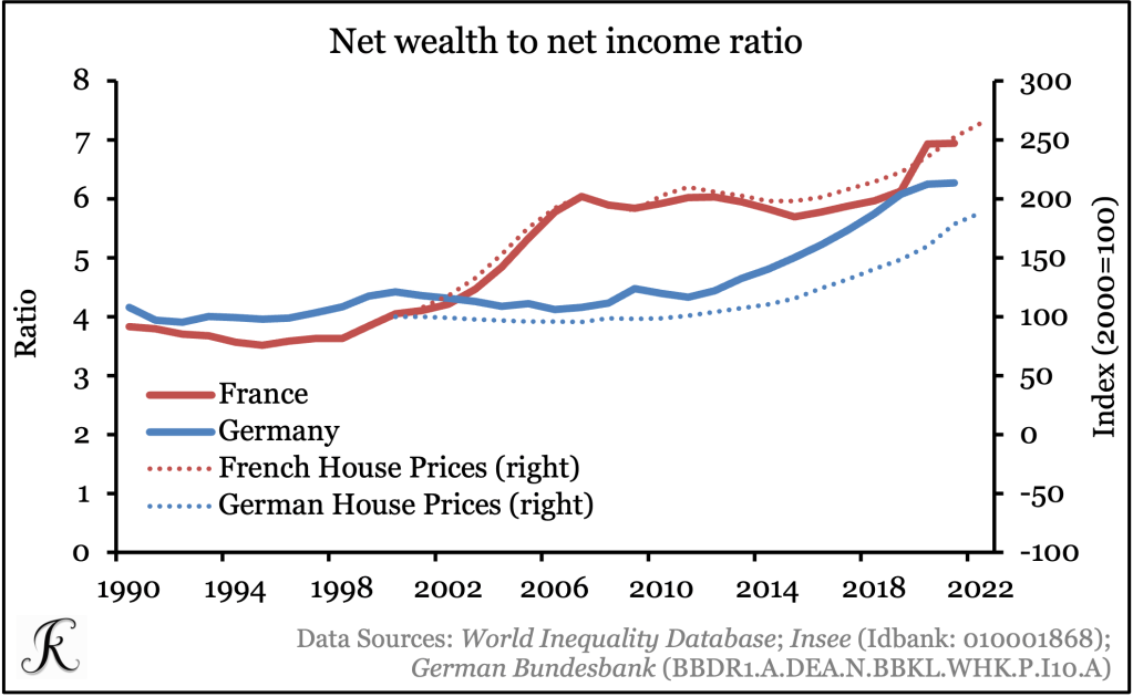 Between the introduction of the euro as an accounting currency in 1999 and the outbreak of the financial crisis of 2007, housing prices in France have doubled. At the same time the net wealth to net income ratio in France has increased substantially. The wealth-to-income ratio is an indicator of social mobility: the higher it is the longer it takes to climb up the wealth ladder in society with a given income. We observe a similar development in Germany where housing prices have doubled since the financial crisis. House price inflation is a form of asset price inflation that is not taken into account in official inflation numbers and that drives up the wealth-to-income ratio.